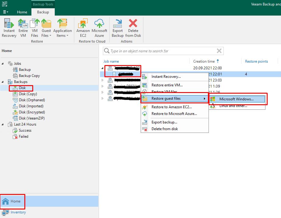 - Перейти Home->Basckups->далее бекапы могут находиться в разделе Disk, Disk (Copy), Disk (Imported), в зависимости от того как были получены бекапы->Выбрать и раскрыть нужный сервер->Нажать ПКМ->Restore guest files->Microsoft Windows…