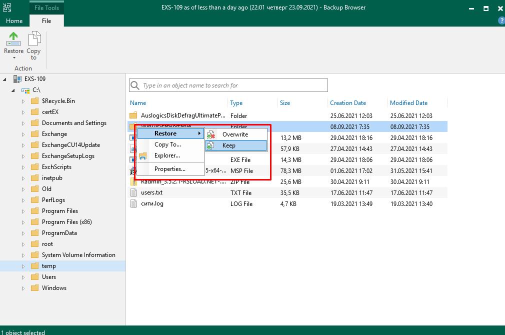 - Restore->Keep – Восстанавливает ресурс в прежней директории (на виртуальную машину-источник, если к ней есть доступ) переименовывая его и сохраняя текущую версию ресурса (если он есть)