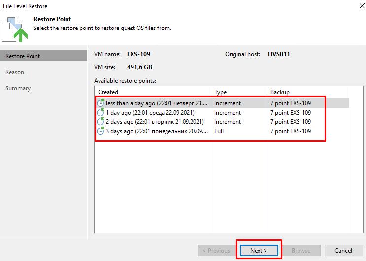 - Выбрать нужный день, когда была создана резервная копия ->нажать Next->Next->Browse